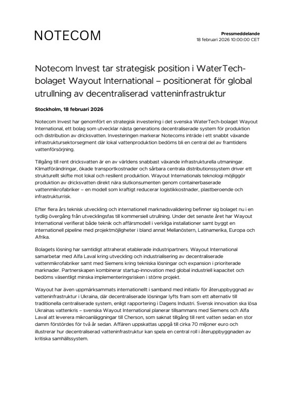 Notecom Invest har genomfört en strategisk investering i det svenska WaterTech-bolaget Wayout International, ett bolag som utvecklar nästa generations decentraliserade system för produktion och distribution av dricksvatten. Investeringen markerar Notecoms inträde i ett snabbt växande infrastruktursektorsegment där lokal vattenproduktion bedöms bli en central del av framtidens vattenförsörjning.
