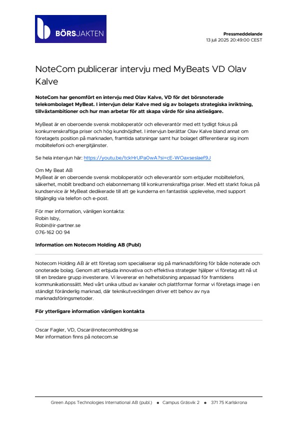 NoteCom har genomfört en intervju med Olav Kalve, VD för det börsnoterade telekombolaget MyBeat. I intervjun delar Kalve med sig av bolagets strategiska inriktning, tillväxtambitioner och hur man arbetar för att skapa värde för sina aktieägare.