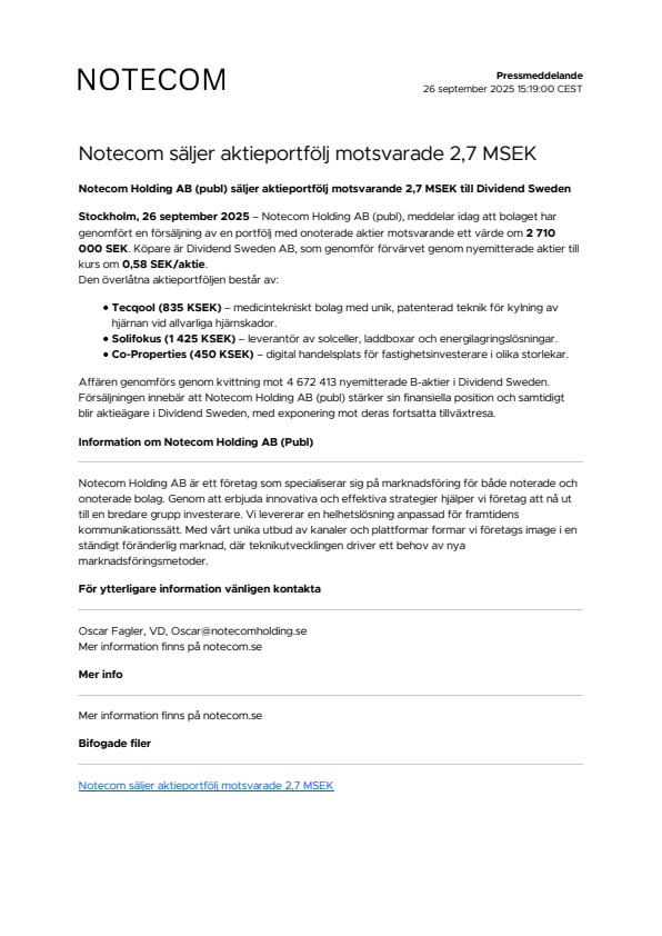 Stockholm, 26 september 2025 – Notecom Holding AB (publ), meddelar idag att bolaget har genomfört en försäljning av en portfölj med onoterade aktier motsvarande ett värde om 2 710 000 SEK. Köpare är Dividend Sweden AB, som genomför förvärvet genom nyemitterade aktier till kurs om 0,58 SEK/aktie.